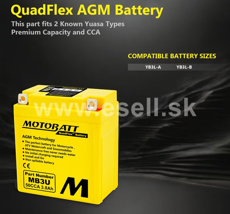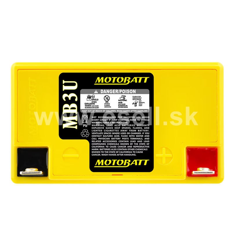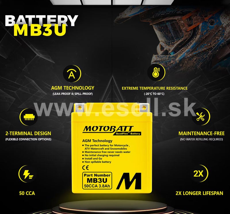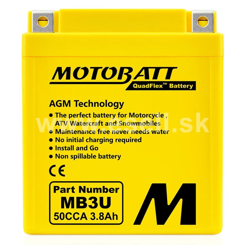 Batérie MOTOBATT sú prémiové motobatérie s veľkou výdržou vyrobené v USA. Vysoko odolná vďaka separátoru zo skleného rúna. Doménou značky MOTOBATT je konštrukčná technológia QuadFlex, ktorá poskytuje veľkú variabilitu pri montáži. Hlavné prednosti modelu MB3U: