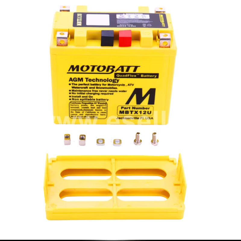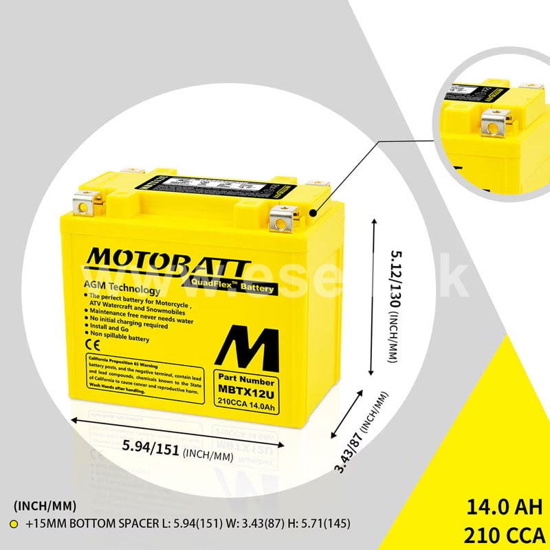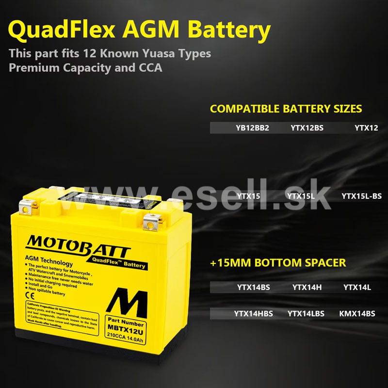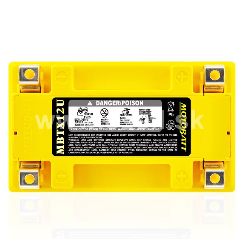 Batérie MOTOBATT sú prémiové motobatérie s veľkou výdržou vyrobené v USA. Vysoko odolná vďaka separátoru zo skleného rúna. Doménou značky MOTOBATT je konštrukčná technológia QuadFlex, ktorá poskytuje veľkú variabilitu pri montáži.