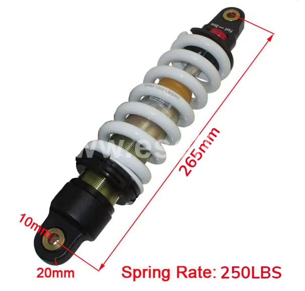 - Pružina 250 LBS je vhodná pre jazdcov s váhou 25-45kg (max. 55kg vrátane všetkej výbavy) - Ttuhosť (približne 4,5 kg/mm). Tento tlmič patrí do kategórie pružín pre detské alebo veľmi ľahké pitbiky. Umožňuje mladým jazdcom efektívne využiť zdvih tlmiča.